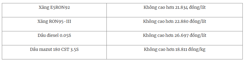 Ở kỳ điều hành này, liên Bộ Công Thương – Tài chính quyết định trích lập Quỹ bình ổn giá xăng dầu (nguồn tạm ứng từ ngân sách Nhà nước) theo các mức cụ thể: Dầu diesel 400 đồng/lít; dầu mazut 400 đồng/kg. Tuy nhiên, liên Bộ Công Thương – Tài chính quyết định không trích chi Quỹ bình ổn giá xăng dầu đối với các mặt hàng xăng dầu.