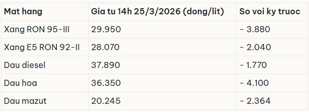 Cập nhật giá xăng dầu trong nước hôm nay 26/3/2026, các mặt hàng xăng dầu đồng loạt giảm tại kỳ điều hành mới lúc 14h chiều ngày 25/3/2026.