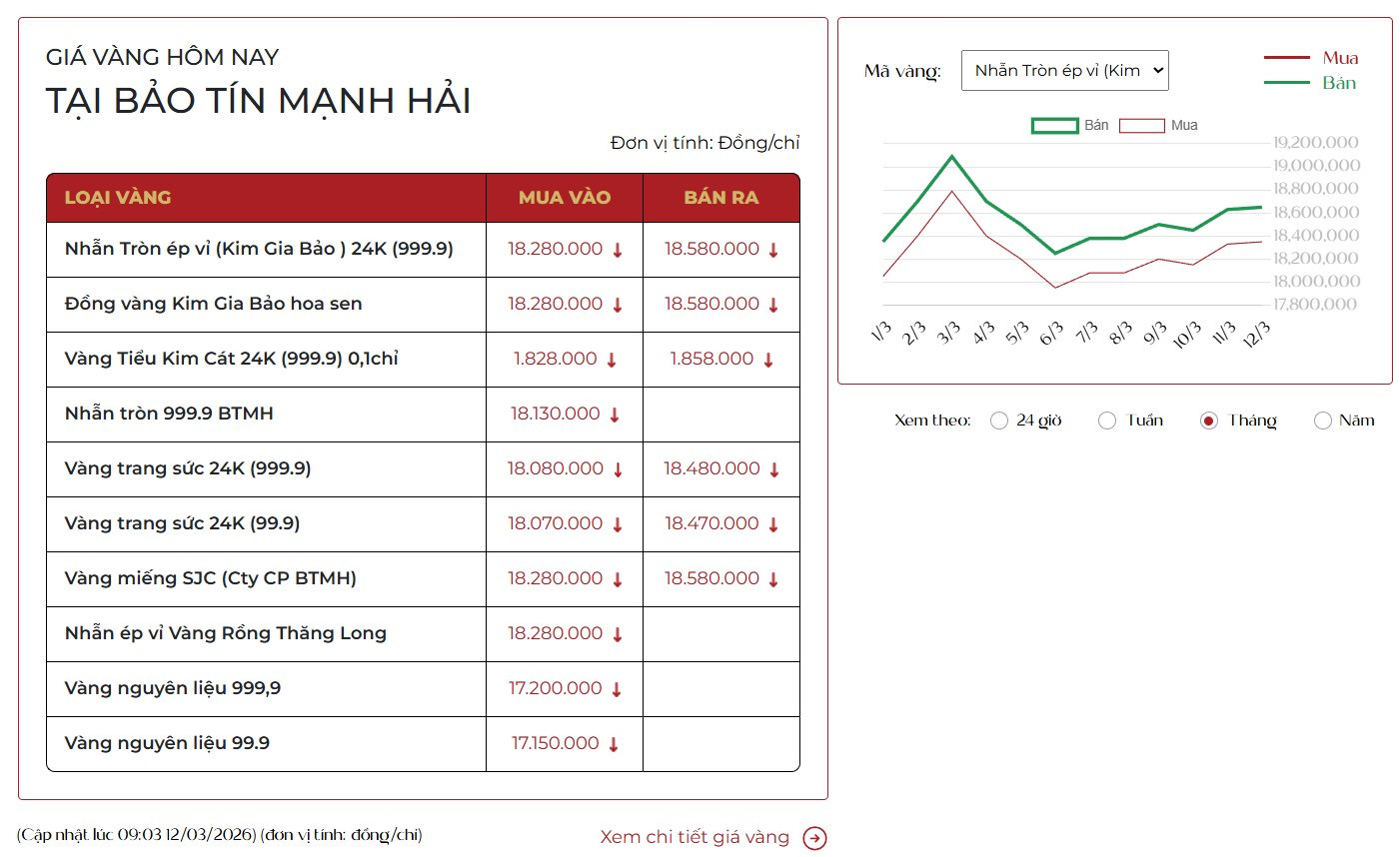 Tại Bảo Tín Mạnh Hải: Hệ thống này ghi nhận mức giảm đồng nhất trên tất cả các mặt hàng. Nhẫn tròn ép vỉ (Kim Gia Bảo) 24K niêm yết ở mức mua vào 18.280.000 đồng/chỉ và bán ra 18.580.000 đồng/chỉ.
